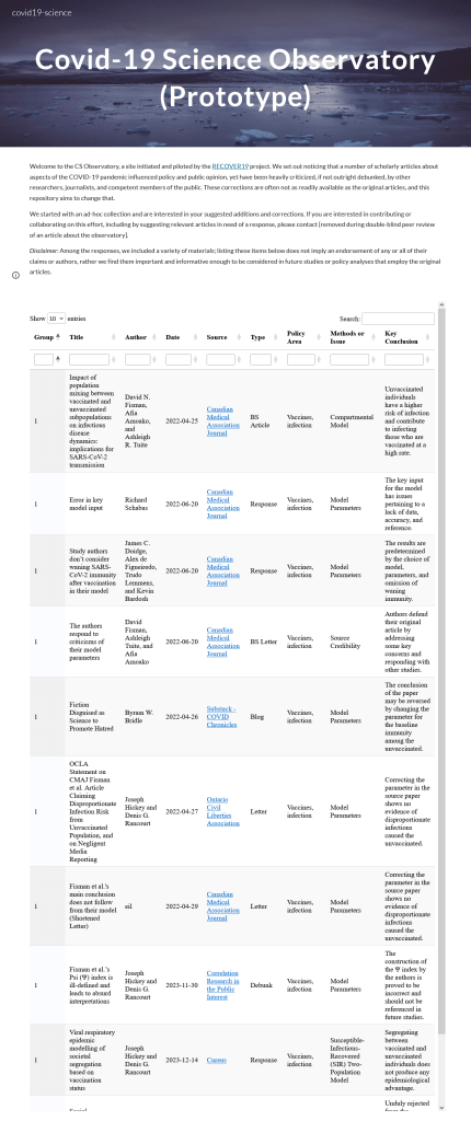 Based on the personal experience of several RECOVER19 investigators with this censorship as well as with writing letters, comments, and responses to published articles, we are piloting the Covid-19 Science Observatory, or short CS Observatory. The goal of this initiative is nothing less than to correct the record of the peer-reviewed literature by making corrections to published articles about the pandemic more readily available to policy-makers and the public, and by encouraging further corrections to be written.